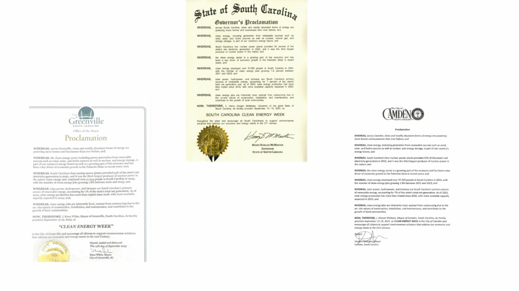 Governor Henry McMaster, along with Greenville Mayor Knox White, Columbia Mayor Daniel Rickenmann, and Camden Mayor Vincent Sheheen, each issued official proclamations recognizing the week. Their support underscores the broad, bipartisan commitment to expanding renewable energy, strengthening the grid, and creating new economic opportunities for South Carolinians.